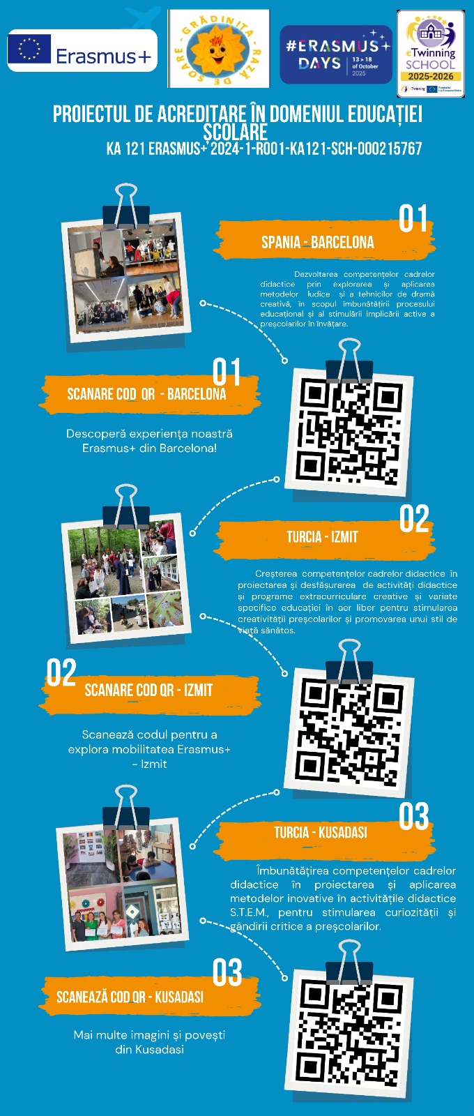 În perioda 13-18.10.2025, în grădinița noastră a fost sărbătorit Erasmus+ Days, marcând activitățile și rezultatele obținute în cadrul programului Erasmus+. Evenimentul a oferit oportunitatea cadrelor didactice, preșcolarilor și părinților să descopere metode inovatoare de predare și bune practici internaționale, dobândite de participanții la mobilități.